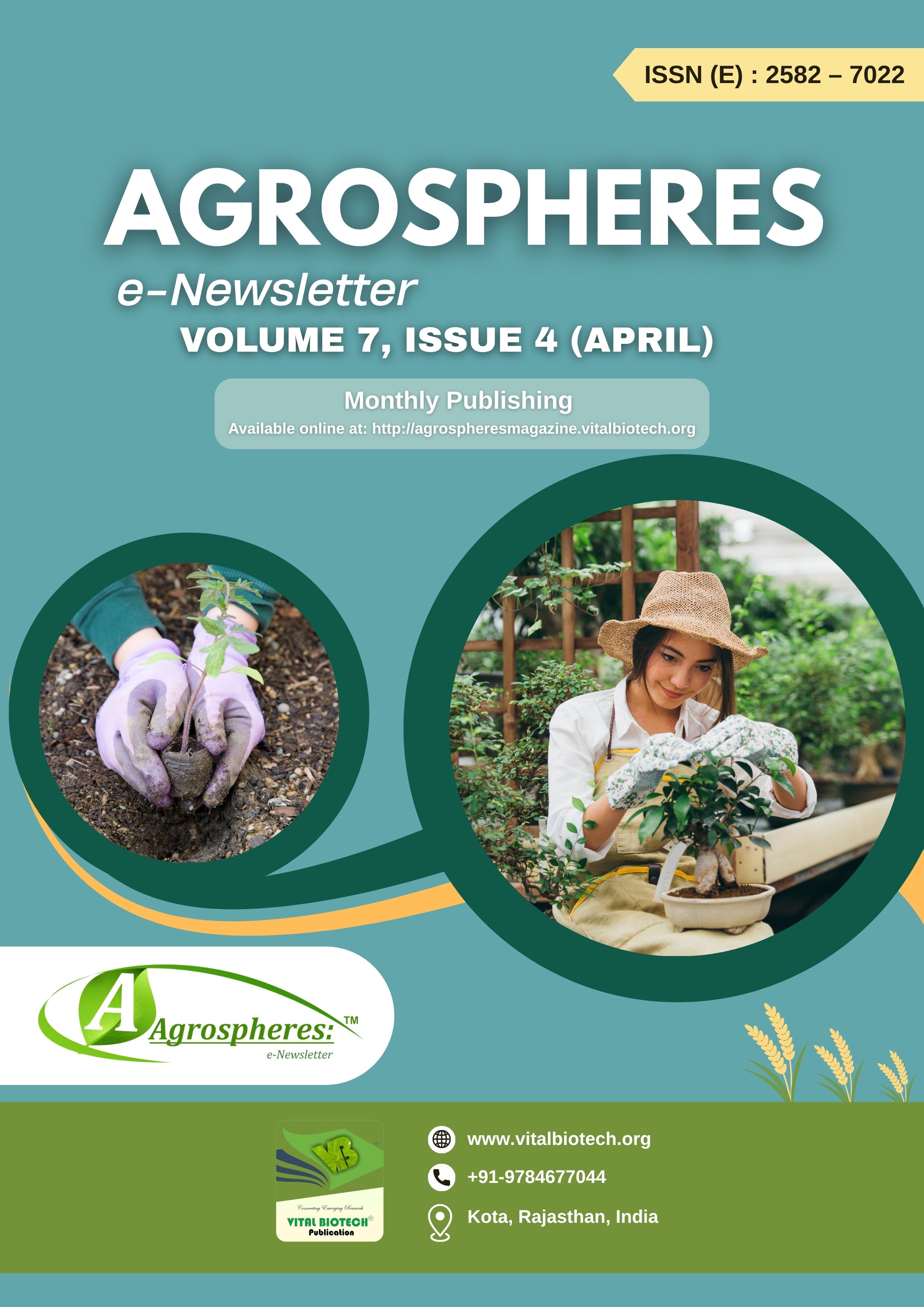 Agrospheres: e-Newsletter is an open access, peer-reviewed, monthly, online magazine cum e-newsletter covering all aspects of Agricultural Sciences. The aim of Agrospheres: e-Newsletter is to publish latest information in field of Crop Sciences, Horticulture Sciences, Animal Sciences, Fisheries Sciences, Natural Resource Management, Plant Protection, Agricultural Engineering and Technology, Social Sciences. This would help in disseminating scientific information and latest findings among the scientific community all over the globe.